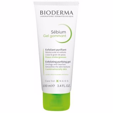 BIODERMA Sébium Gel Gommant, gommage exfoliant doux à double action (mécanique et chimique), conçu pour désincruster les pores, affiner le grain de peau et purifier les peaux mixtes à grasses sans agresser.