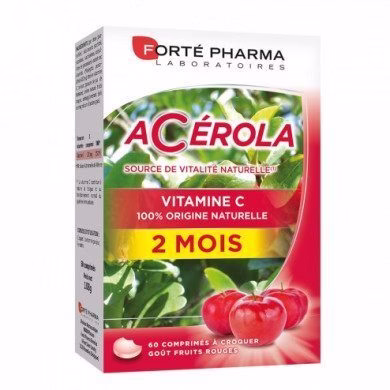 FORTE PHARMA ACEROLA 60 Comprimés à croquer riches en vitamine C d’origine naturelle, pour aider à réduire la fatigue et renforcer les défenses immunitaires au quotidien.